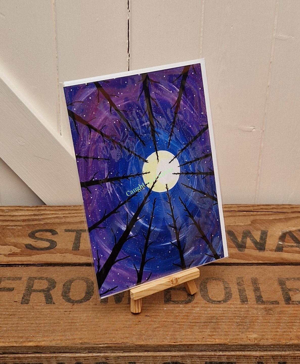 Imagine looking up through the trees taking in the wonder of the moon and stars. Created using acrylics. Size is 42 x 30 x 1.5cm. Signed on the reverse and initialed on the front corner.