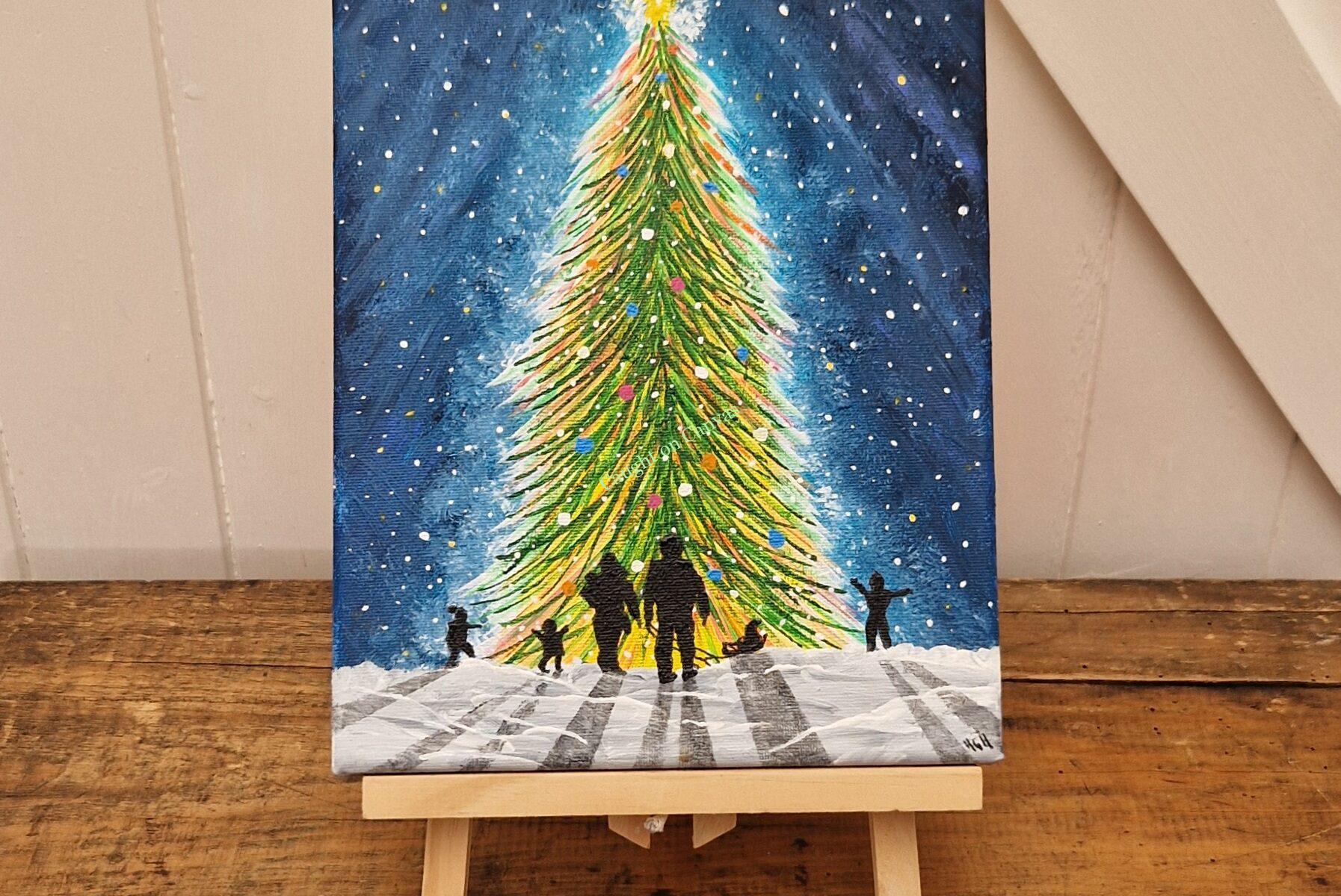 A family enjoying the spirit of Christmas. Original painted using acrylic. Size is 25.5 x 20.5 x 1.5cm. Signed on the reverse and initialed on the front corner.