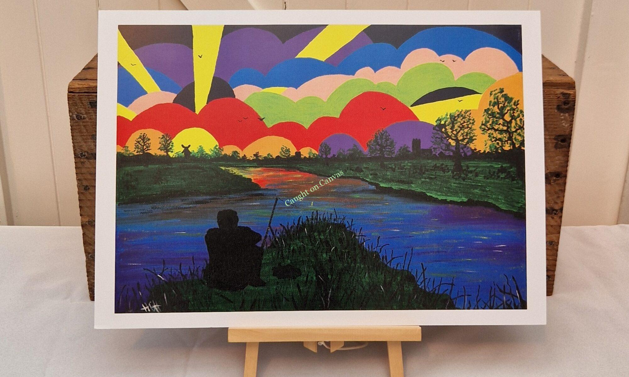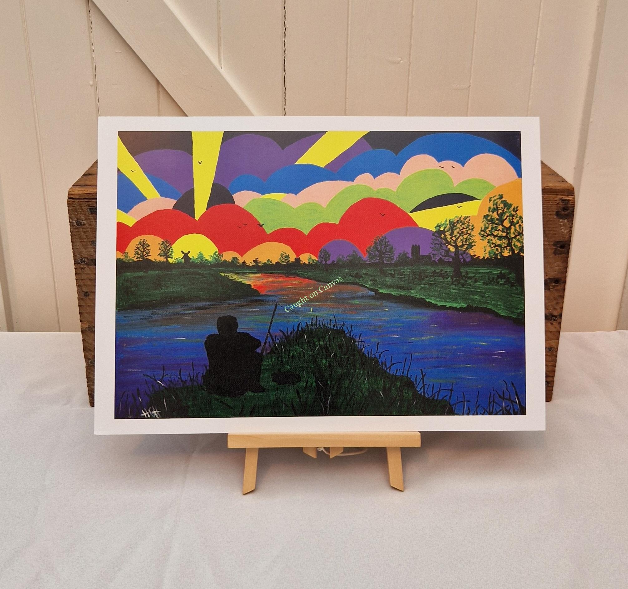 A colourful abstract view of a fisherman peacefully sitting on the riverbank watching the sun set.