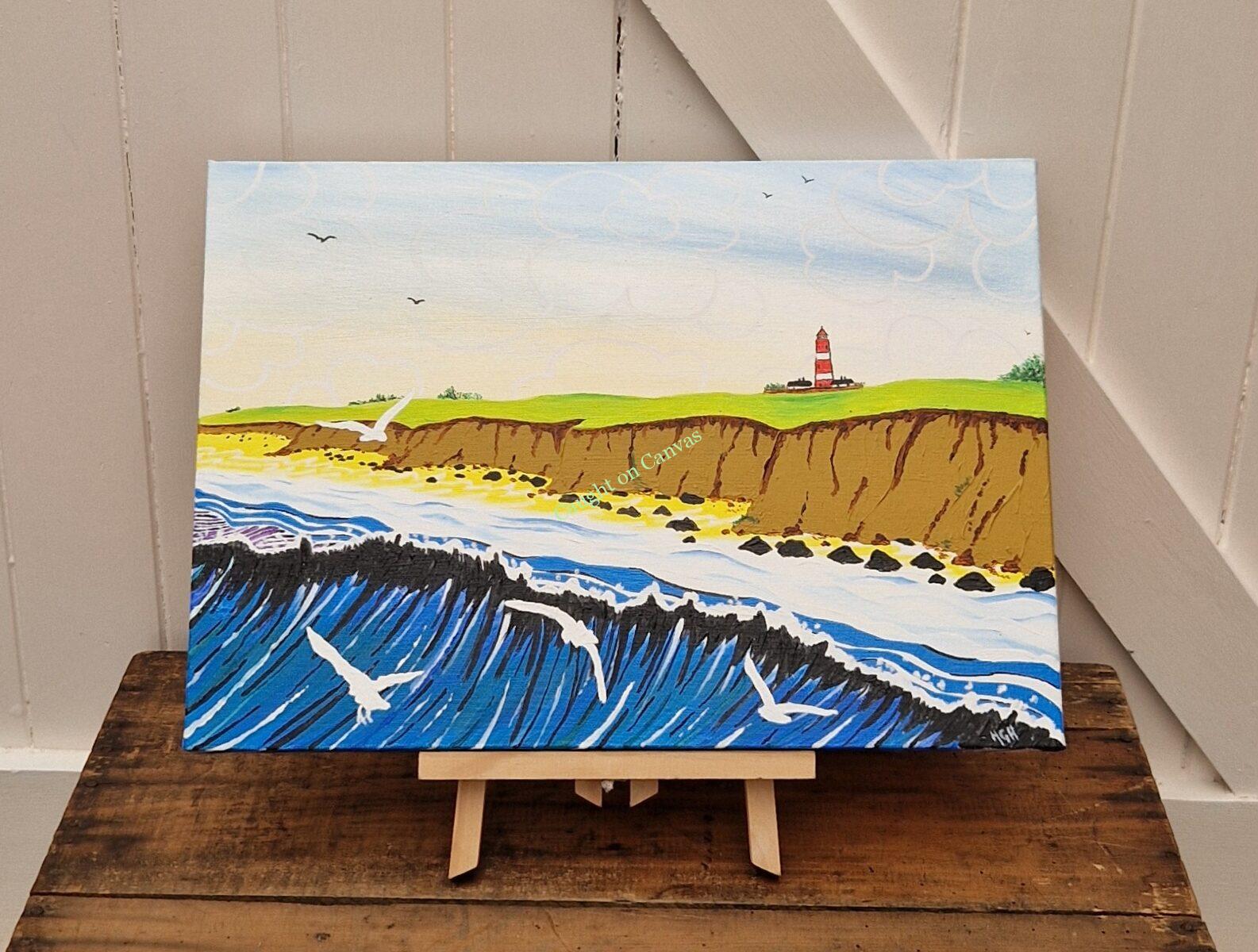 Four gulls flying high around the coast at Happisburgh. Painted using acrylic. Canvas size is 42 x 30 x 1.5cm. Signed on the reverse and initialed on the front corner. Free P&P to the UK.