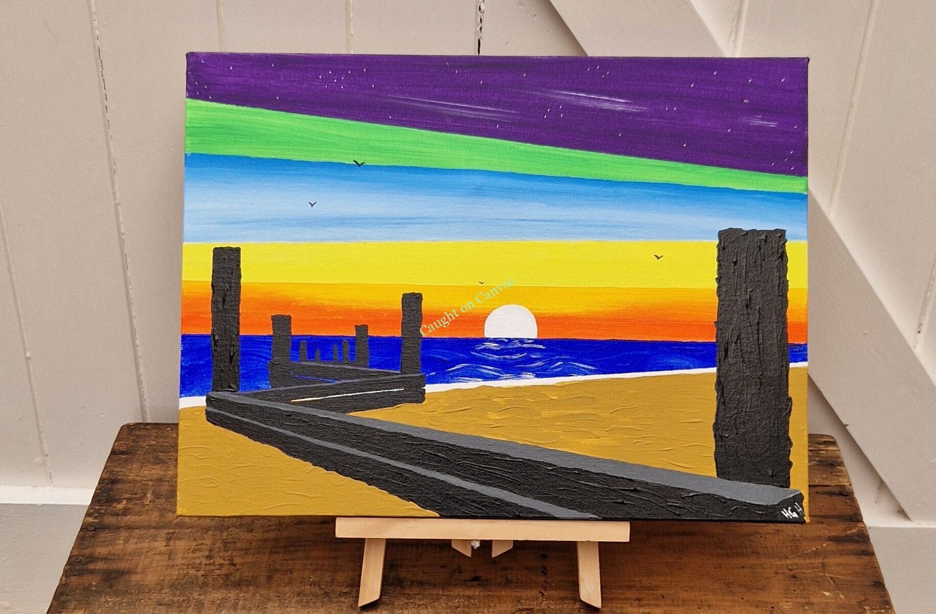 Stunning, colourful abstract view of the groynes at Walcott on the North Norfolk coast. Created using acrylics. Size is 42 x 30 x 1.5cm. Signed on the reverse and initialed on the front corner. Free P&P to the UK.