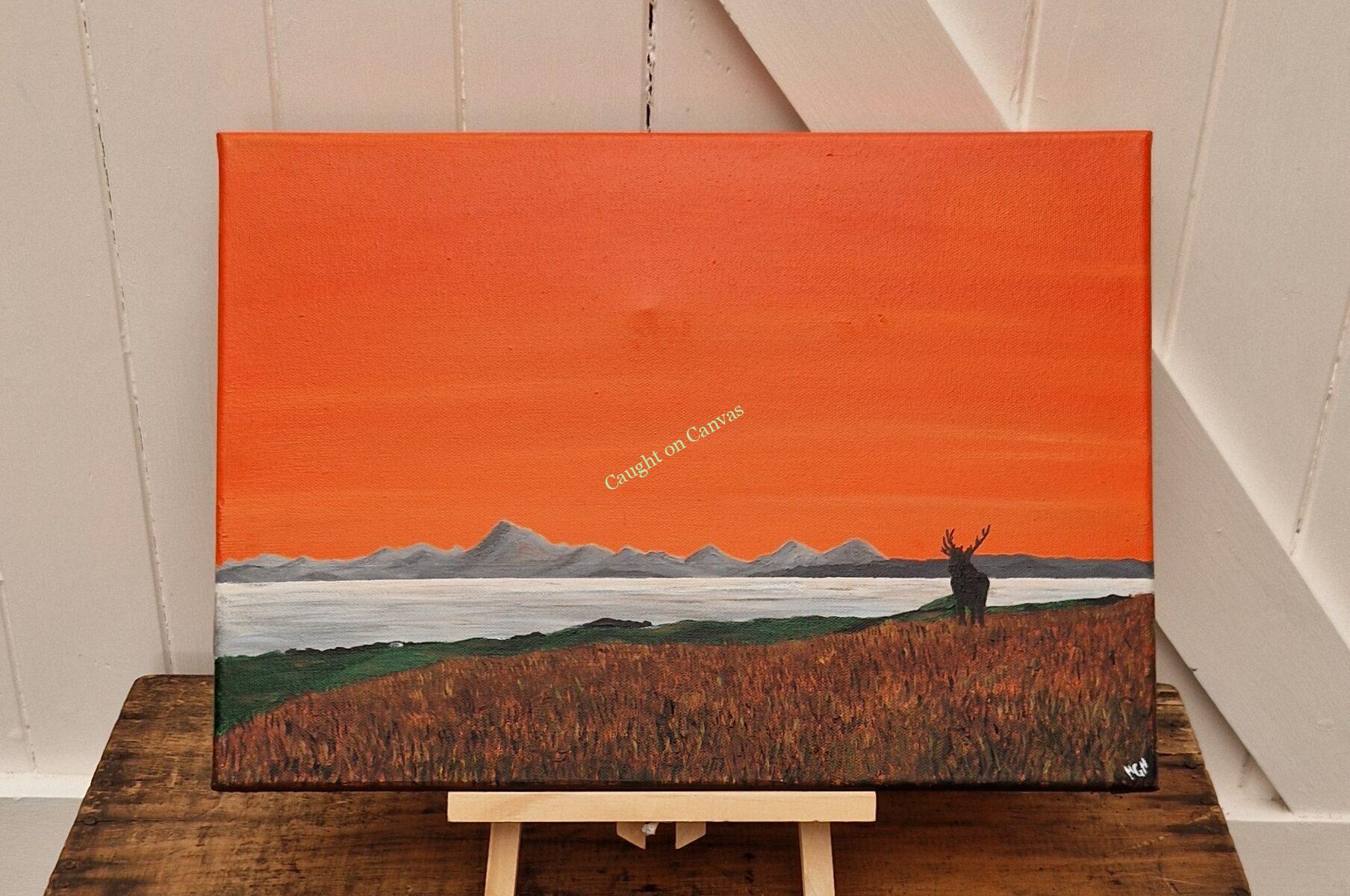 A lone stag surveying his territory in Scotland. Created using acrylics. Size is 42 x 29.5 x 1.5cm. Signed on the reverse and initialed on the front corner. FREE P&P TO THE UK.