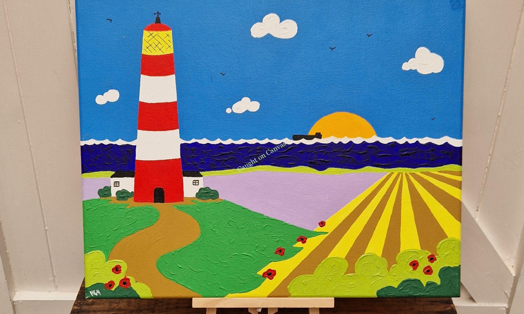 An alternative view of Happisburgh Lighthouse on the North Norfolk coast. Canvas created using acrylics. Size is 50 x 40 x 1.5cm. Signed on the reverse and initialed on the front corner. Free P&P to the UK.
