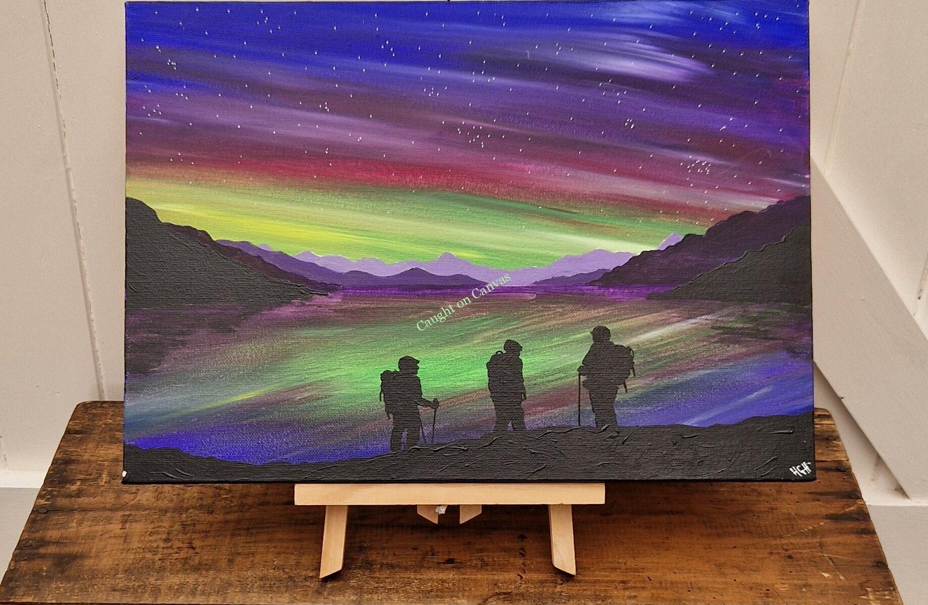 Three walkers crossing Loch Lomond, Scotland with a Northern Lights feel. Created using acrylics. Size is 42 x 30 x 1.5cm. Signed on the reverse and initialed on the front corner. FREE P&P TO THE UK.