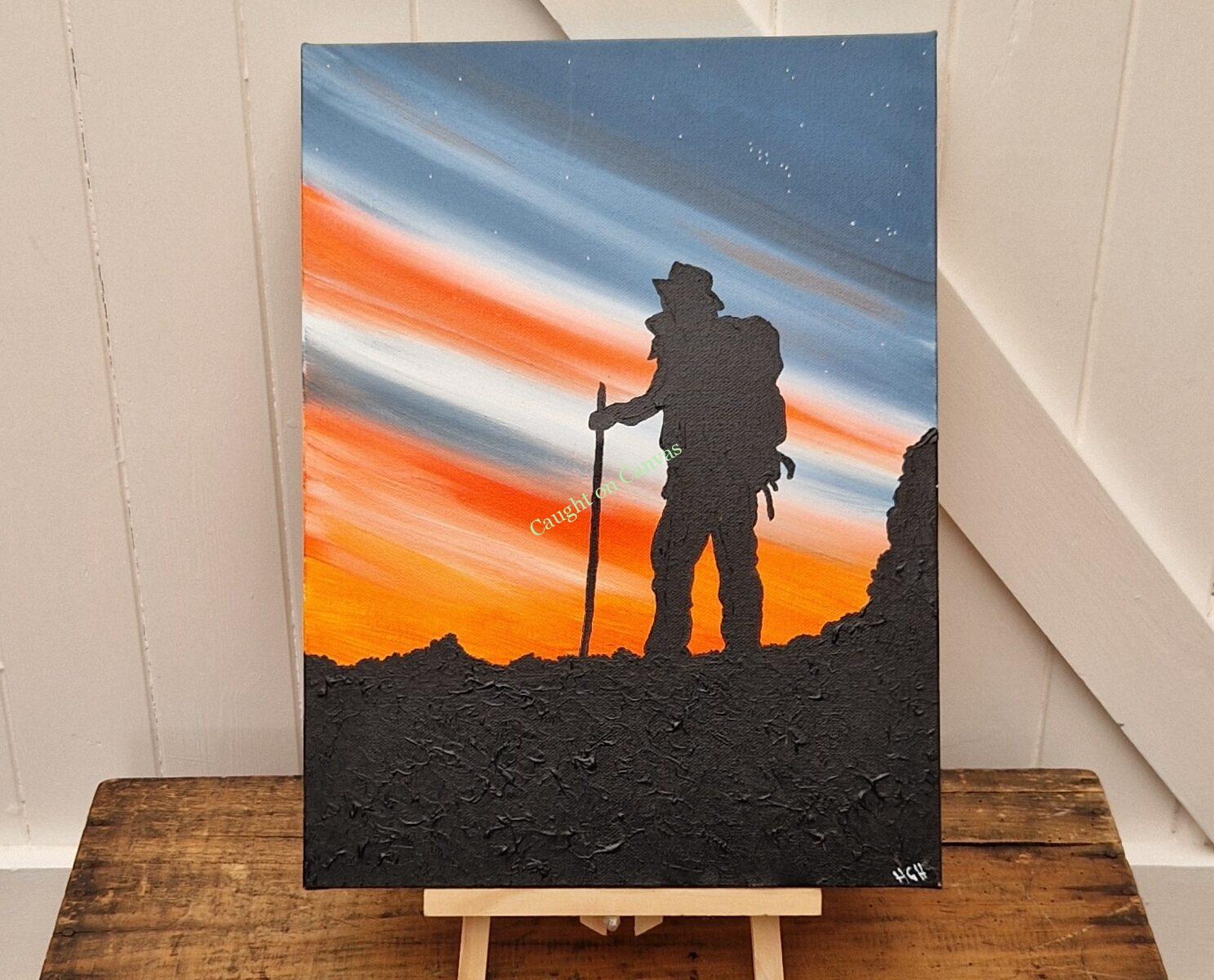 Hiker on a mountain soaking in the stunning views and the incredible evening sky. Created using acrylics. Size is 40.5 x 30 x 1.5cm. Signed on the reverse and initialed on the front corner. Free P&P to the UK