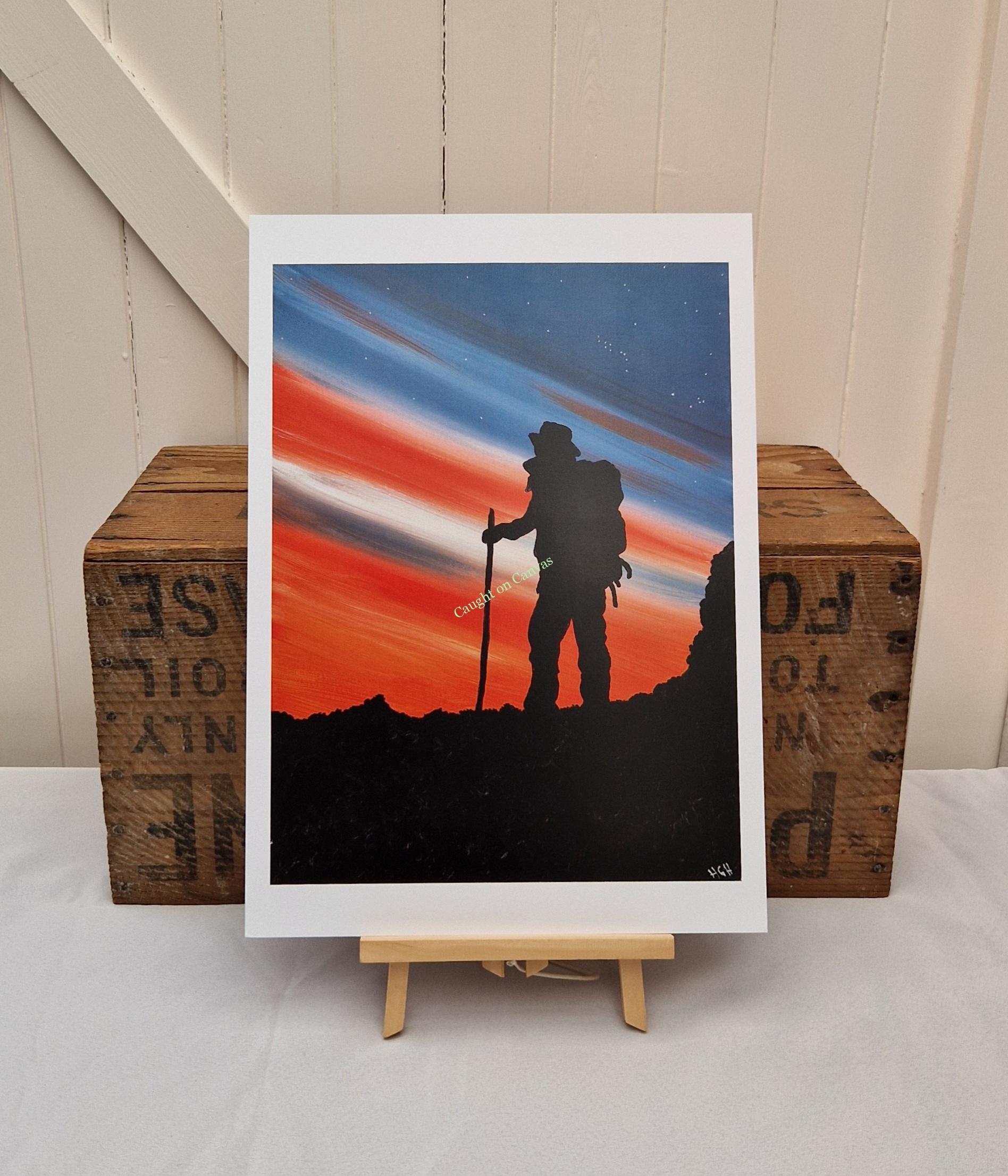 Hiker on a mountain soaking in the stunning views and the incredible evening sky. Created using acrylics. Size is 40.5 x 30 x 1.5cm. Signed on the reverse and initialed on the front corner. Free P&P to the UK