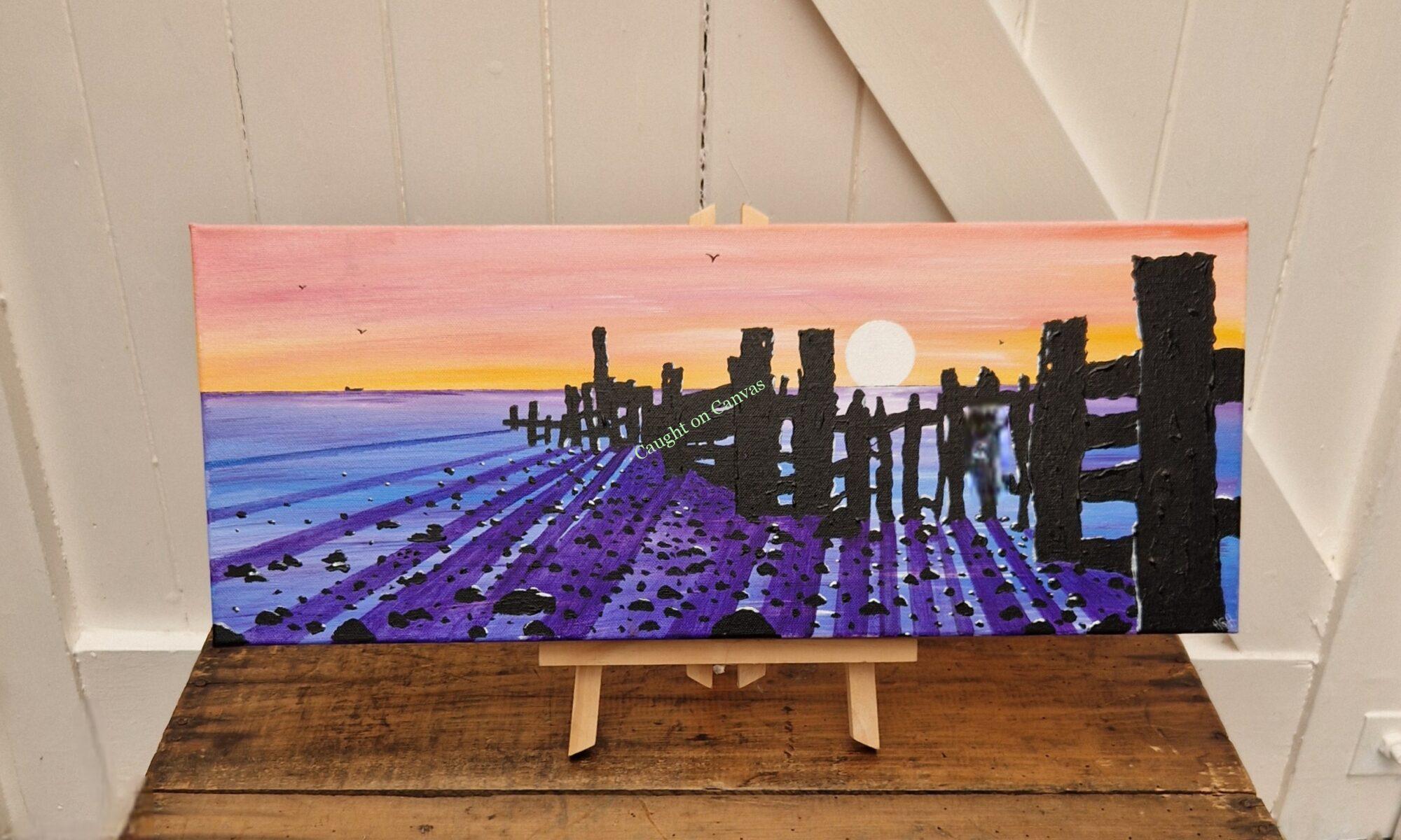 An original, unique canvas painted by Horis of a beach scene in Mundesley, Norfolk. Canvas size is 50 x 20 x 4cm. Signed on the reverse and initialed on the front corner.