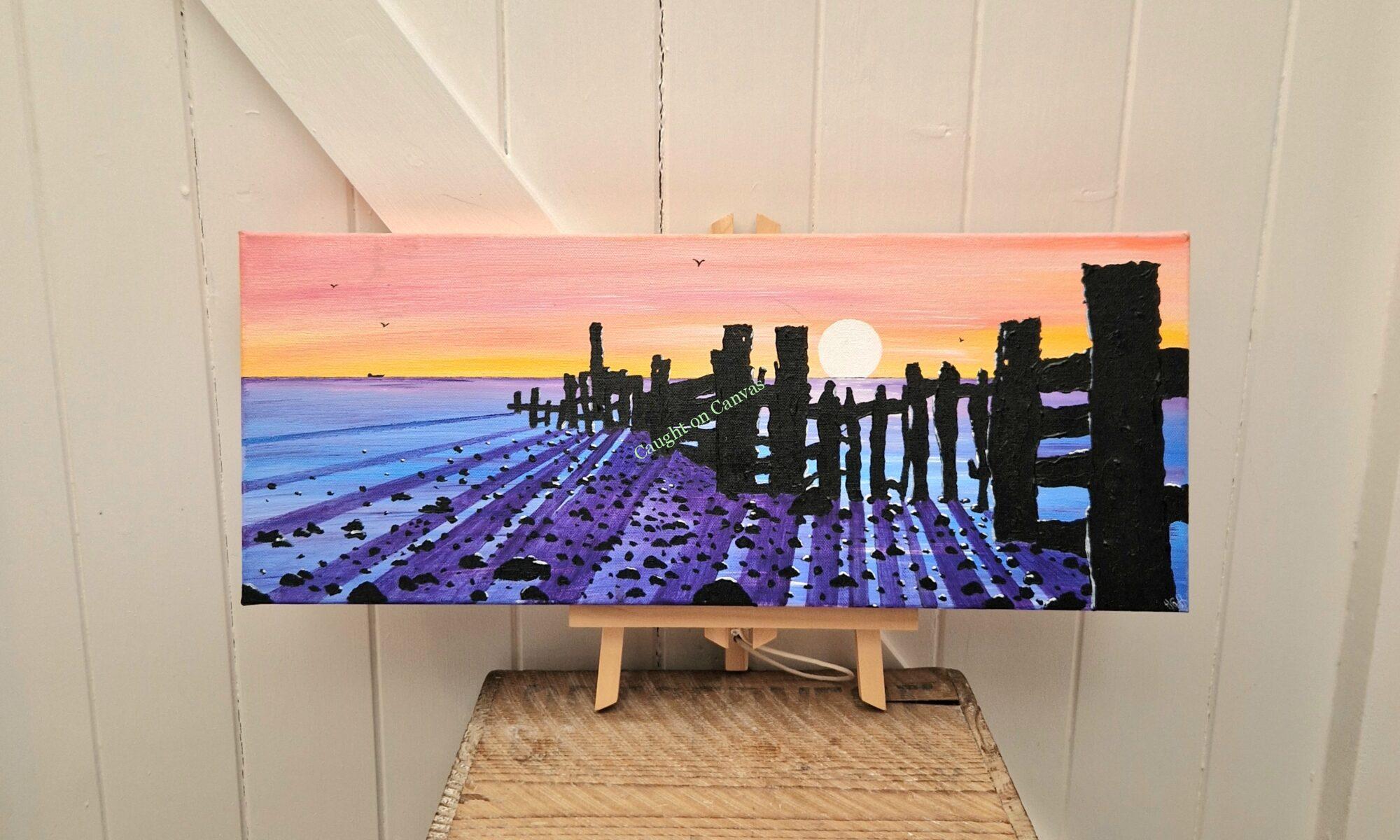 An original, unique canvas painted by Horis of a beach scene in Mundesley, Norfolk. Canvas size is 50 x 20 x 4cm. Signed on the reverse and initialed on the front corner.