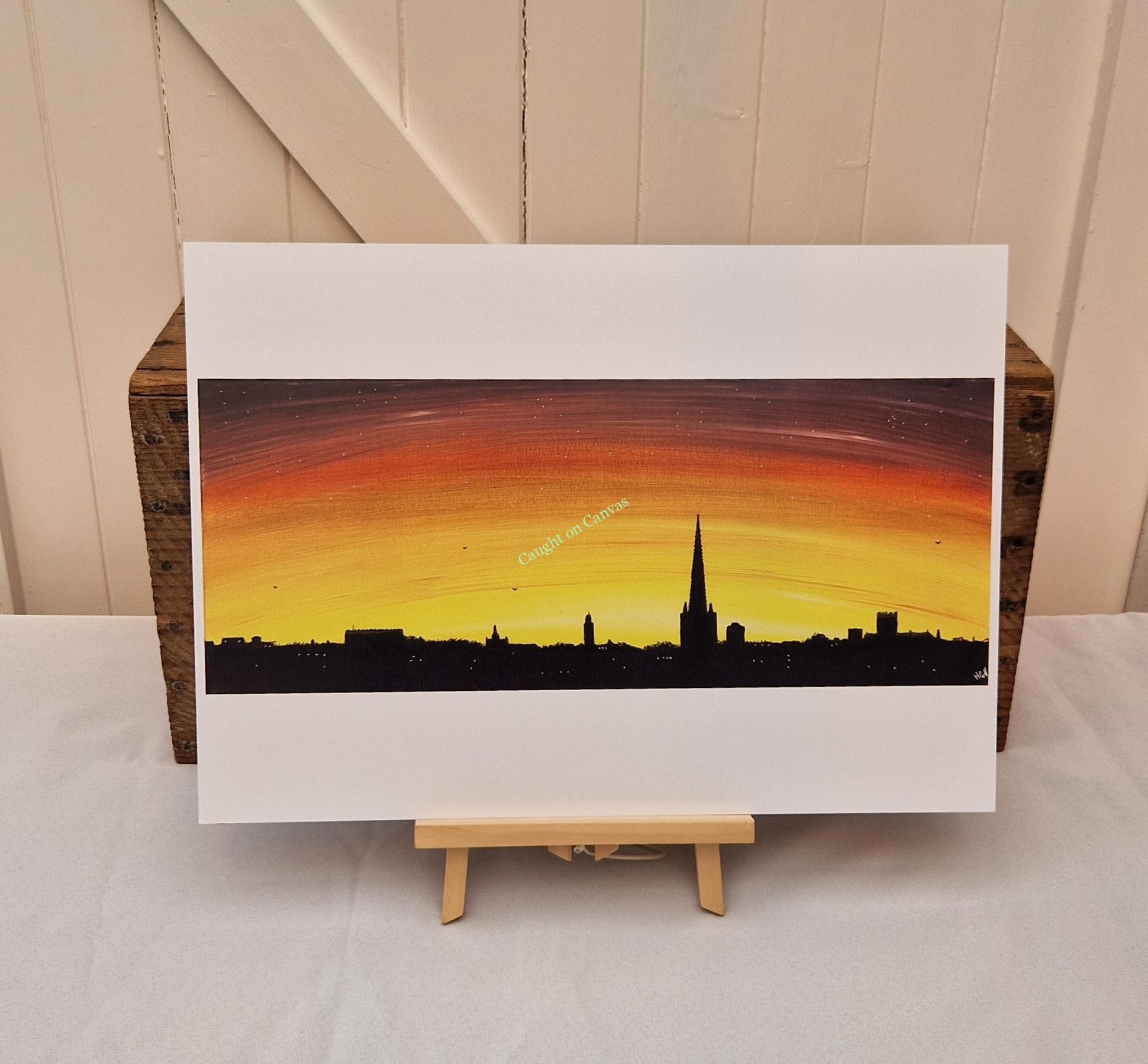 The iconic city of Norwich, Norfolk silhouetted at sunrise. Canvas size is 50 x 20 x 4cm. Signed on the reverse and initialed on the front corner.