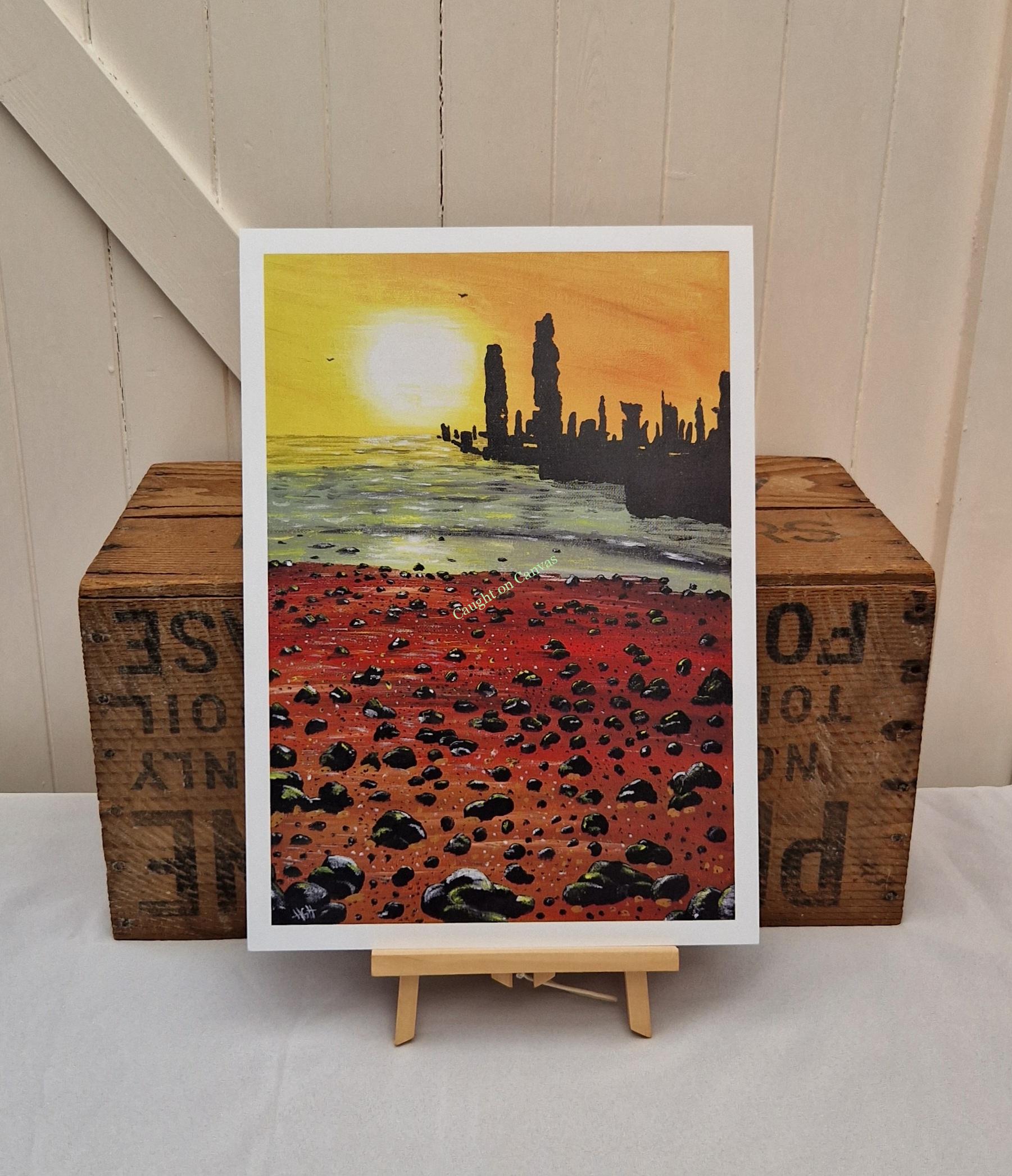 Overstrand beach on the North Norfolk coast on a very sunny beautiful early morning. Created using acrylic. Size is 42 x 30 x 1.5cm. Canvas signed on the reverse and initialed on the front corner.