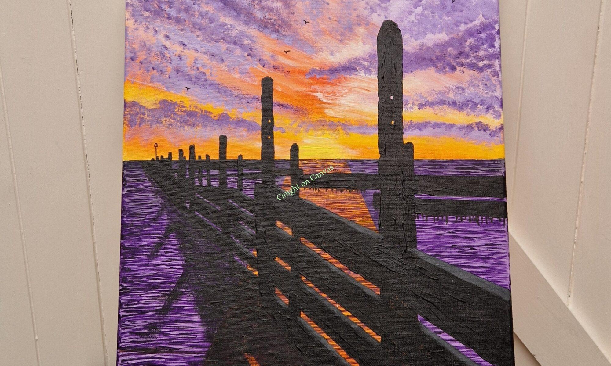 Silhouetted beach groynes coupled with a purple background. Canvas size is 50 x 40 x 1.5cm. Signed on the reverse and initialed on the front corner. FREE P&P TO UK.