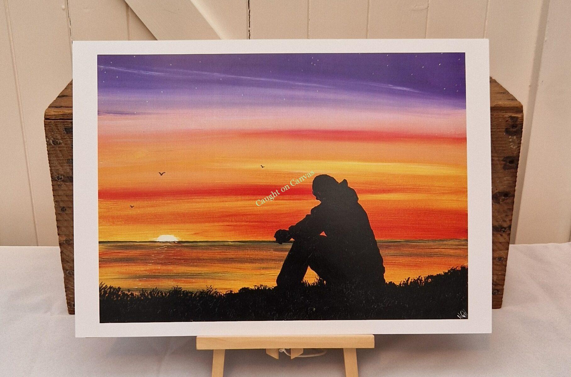 A beautiful print of a person sitting on the dunes taking in the sight of a stunning sunset.