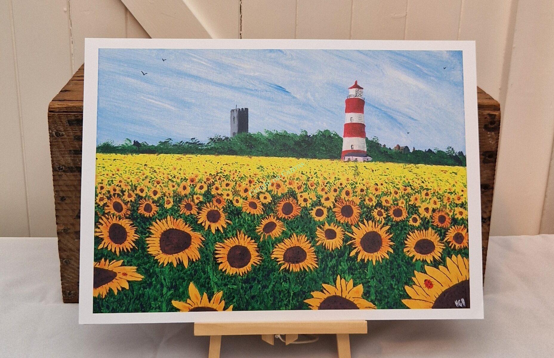 A gorgeous sunflower filled image of Happisburgh lighthouse and church.