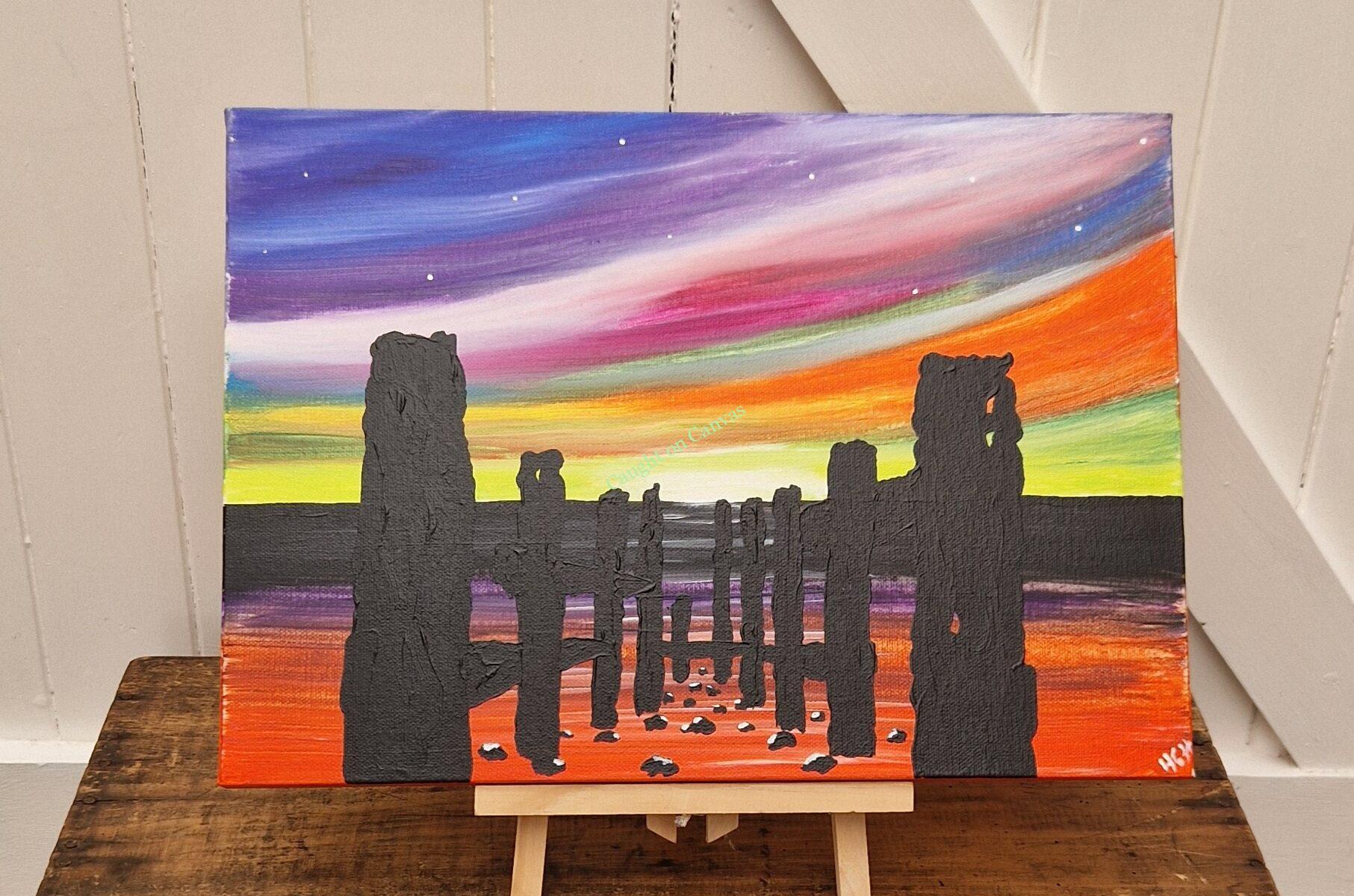 Walcott groynes on the North Norfolk coast. Created using acrylics. Canvas size is 42 x 30 x 1.5cm. Signed on the reverse and initialed on the front corner.